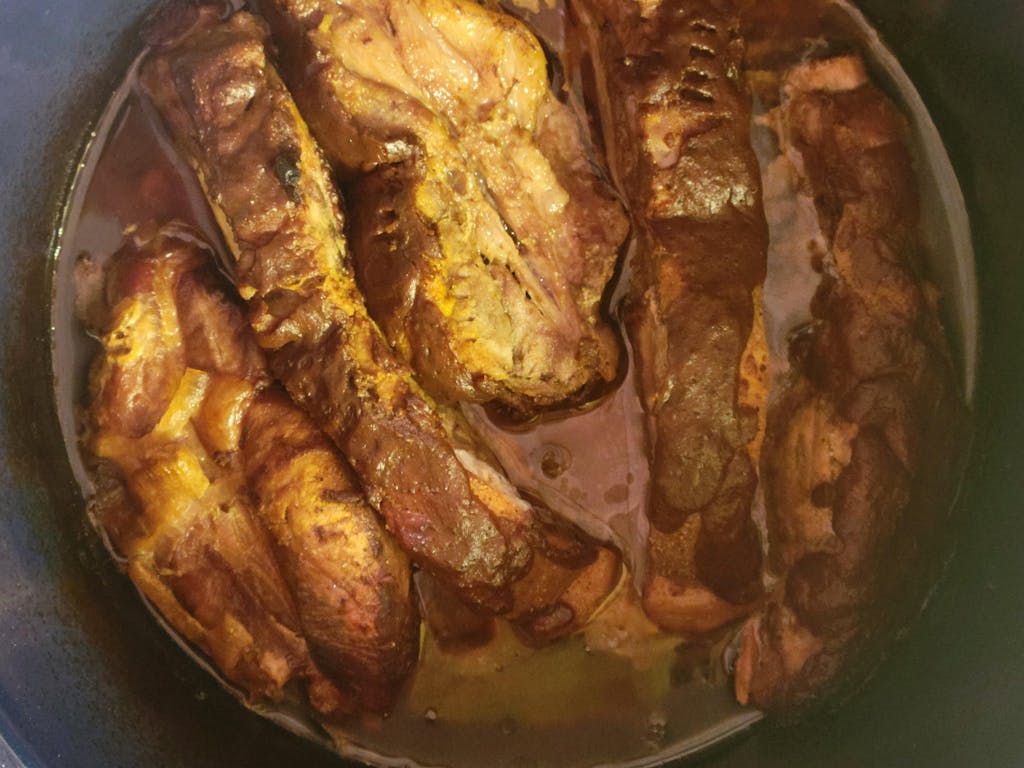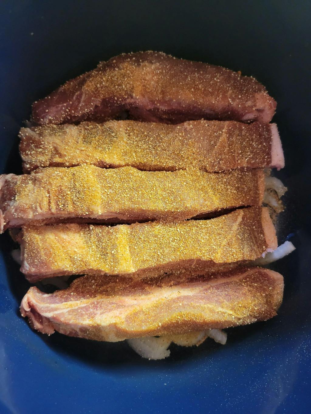 Simple recipe, thinly sliced onions on the bottom, place the ribs and cover with Volcanic Sunset.